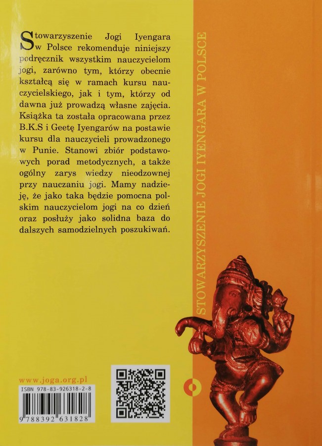 Drugie, poprawione wydanie podręcznika, przeznaczonego dla wszystkich nauczycieli jogi: zarówno tych, którzy obecnie kształcą się w ramach kursu nauczycielskiego, jak i tych, którzy od dawna prowadzą własne zajęcia. Książka została opracowana przez B.K.S. i Geetę Iyengarów na podstawie kursu dla nauczycieli prowadzonego w Punie. Stanowi wzór podstawowych porad metodycznych, a także ogólny zarys wiedzy nieodzownej przy nauczaniu jogi. Mamy nadzieję, że jako taka będzie pomocna polskim nauczycielom jogi na co dzień oraz posłuży jako solidna baza do dalszych samodzielnych poszukiwań.